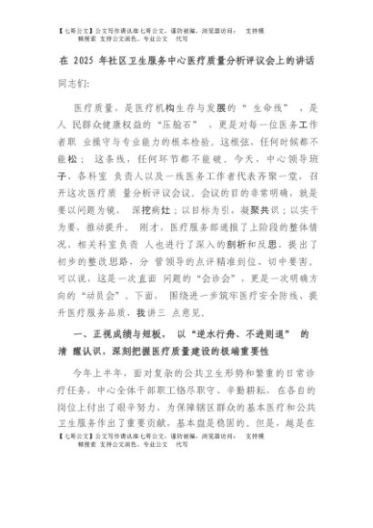 【七哥公文】2025年:在2025年社区卫生服务中心医疗质量分析评议会上的讲话+更多免费公文+VX:QiGeGongWen2024
