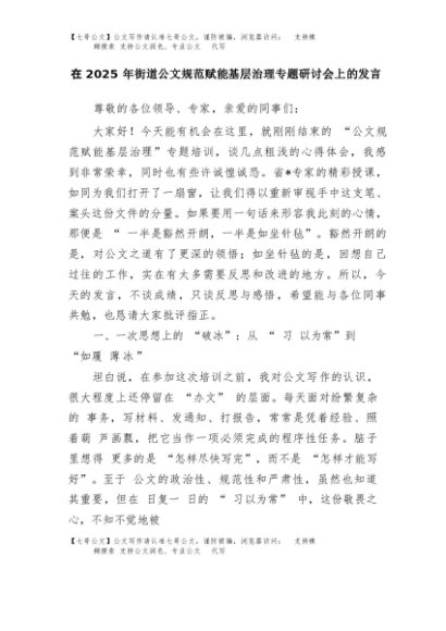 【七哥公文】2025年:在2025年街道公文规范赋能基层治理专题研讨会上的发言+更多免费公文+VX:QiGeGongWen2024