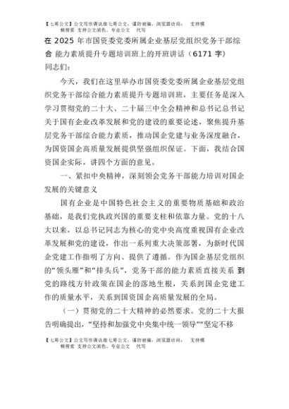 【七哥公文】2025年:在2025年市国资委党委所属企业基层党组织党务干部综合能力素质提升专题培训班上的开班讲话(6171字)+更多免费公文+VX:QiGeGongWen2024