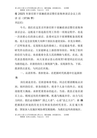 【七哥公文】2025年:在2025年新任职干部廉政谈话暨任前集体谈话会议上的讲话(3736字)+更多免费公文+VX:QiGeGongWen2024