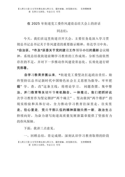 / 【七哥公文】2025年:在2025年街道党工委作风建设总结大会上的讲话+更多免费公文+VX:QiGeGongWen2024