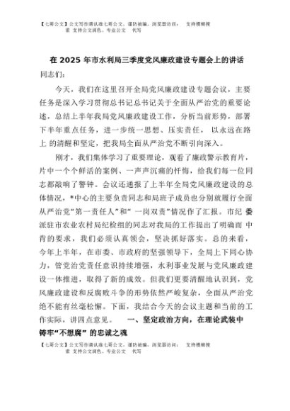 【七哥公文】2025年:在2025年市水利局三季度党风廉政建设专题会上的讲话+更多免费公文+VX:QiGeGongWen2024