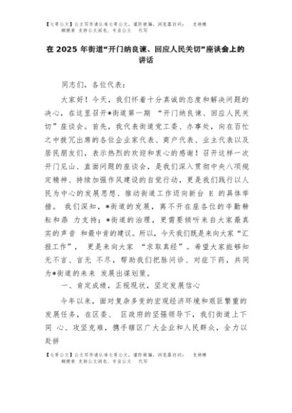 【七哥公文】2025年:在2025年街道“开门纳良谏、回应人民关切”座谈会上的讲话+更多免费公文+VX:QiGeGongWen2024