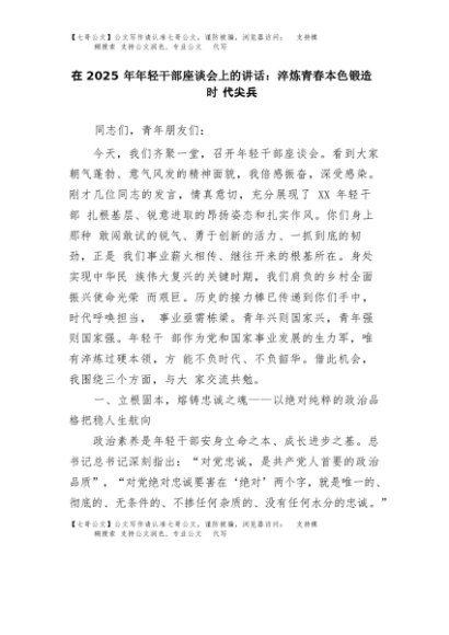 【七哥公文】2025年:在2025年年轻干部座谈会上的讲话:淬炼青春本色锻造时代尖兵+更多免费公文+VX:QiGeGongWen2024