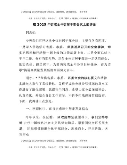 / 【七哥公文】2025年:在2025年街道全体街居干部会议上的讲话+更多免费公文+VX:QiGeGongWen2024
