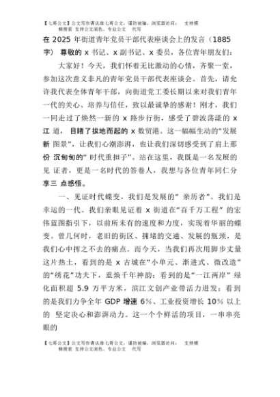【七哥公文】2025年:在2025年街道青年党员干部代表座谈会上的发言(1885字)+更多免费公文+VX:QiGeGongWen2024