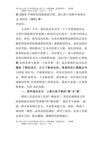 【七哥公文】2025年:在2025年财政系统新提拔任职、新入职干部集中座谈会上的讲话(3851字)+更多免费公文+VX:QiGeGongWen2024
