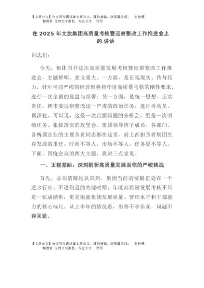 【七哥公文】2025年:在2025年文旅集团高质量考核暨巡察整改工作推进会上的讲话+更多免费公文+VX:QiGeGongWen2024