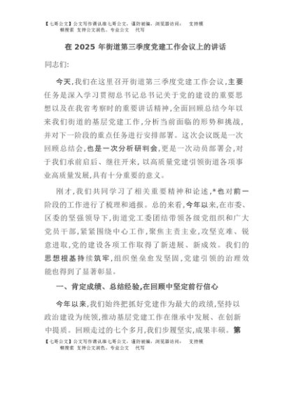 / 【七哥公文】2025年:在2025年街道第三季度党建工作会议上的讲话+更多免费公文+VX:QiGeGongWen2024