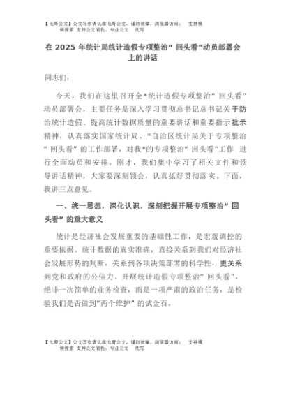 【七哥公文】2025年:在2025年统计局统计造假专项整治“回头看”动员部署会上的讲话+更多免费公文+VX:QiGeGongWen2024