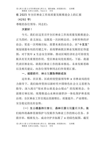 【七哥公文】2025年:在2025年全区林业工作高质量发展推进会上的汇报(4292字)+更多免费公文+VX:QiGeGongWen2024