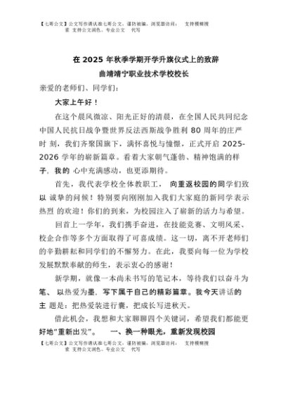 / 【七哥公文】2025年:在2025年秋季学期开学升旗仪式上的致辞+更多免费公文+VX:QiGeGongWen2024