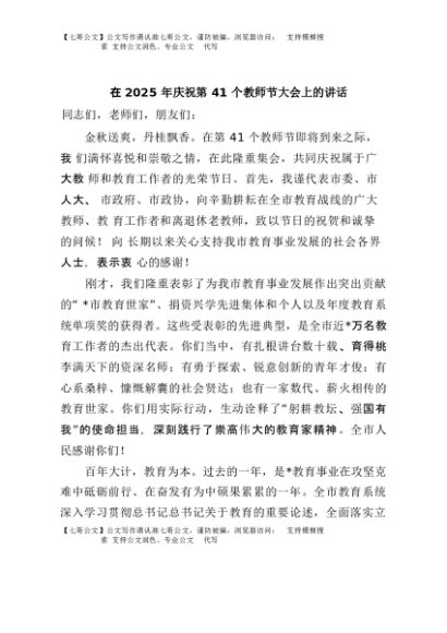/ 【七哥公文】2025年:在2025年庆祝第41个教师节大会上的讲话+更多免费公文+VX:QiGeGongWen2024