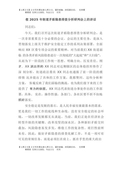 / 【七哥公文】2025年:在2025年街道矛盾隐患排查分析研判会上的讲话+更多免费公文+VX:QiGeGongWen2024