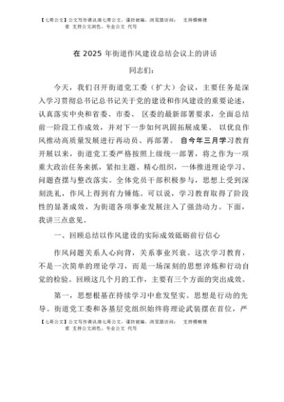 / 【七哥公文】2025年:在2025年街道作风建设总结会议上的讲话+更多免费公文+VX:QiGeGongWen2024