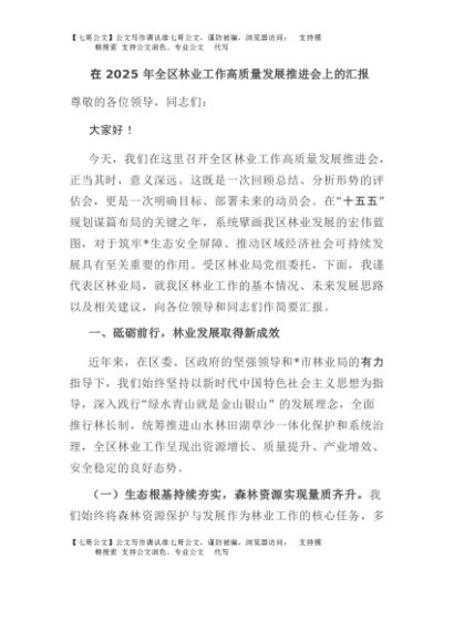 【七哥公文】2025年:在2025年全区林业工作高质量发展推进会上的汇报+更多免费公文+VX:QiGeGongWen2024