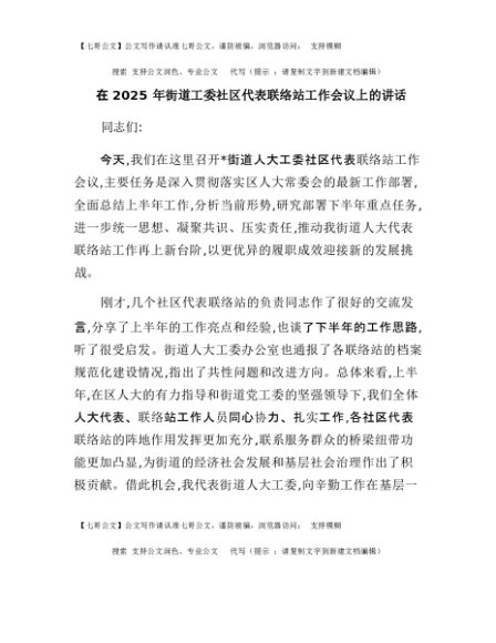 【七哥公文】2025年:在2025年街道工委社区代表联络站工作会议上的讲话+更多免费公文+VX:QiGeGongWen2024