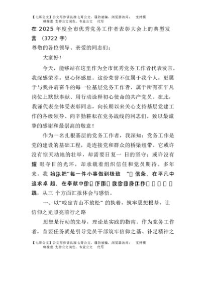 【七哥公文】2025年:在2025年度全市优秀党务工作者表彰大会上的典型发言(3722字)+更多免费公文+VX:QiGeGongWen2024