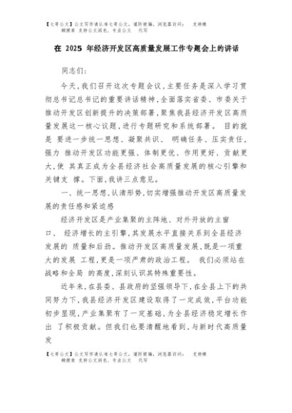 【七哥公文】2025年:在2025年经济开发区高质量发展工作专题会上的讲话+更多免费公文+VX:QiGeGongWen2024