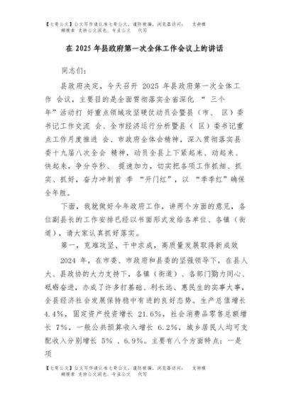 / 【七哥公文】2025年:在2025年县政府第一次全体工作会议上的讲话+更多免费公文+VX:QiGeGongWen2024