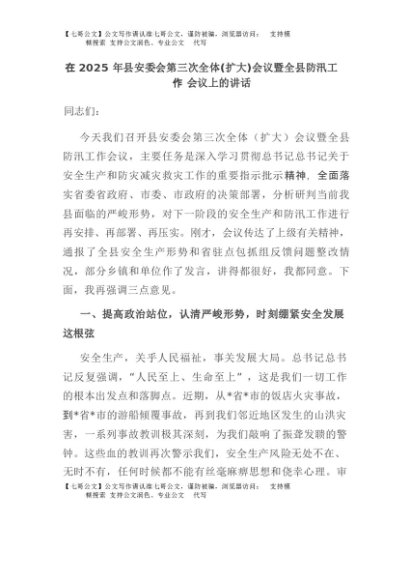 【七哥公文】2025年:在2025年县安委会第三次全体(扩大)会议暨全县防汛工作会议上的讲话+更多免费公文+VX:QiGeGongWen2024