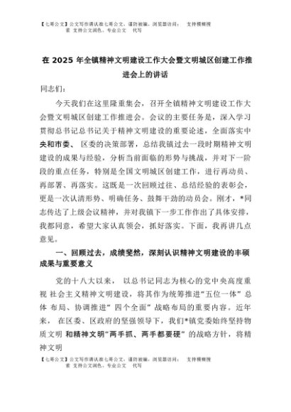 【七哥公文】2025年:在2025年全镇精神文明建设工作大会暨文明城区创建工作推进会上的讲话+更多免费公文+VX:QiGeGongWen2024
