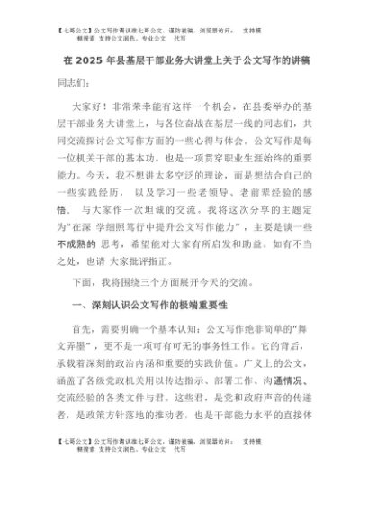 【七哥公文】2025年:在2025年县基层干部业务大讲堂上关于公文写作的讲稿+更多免费公文+VX:QiGeGongWen2024