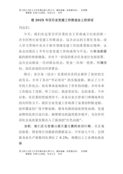 / 【七哥公文】2025年:在2025年区行业党建工作推进会上的讲话+更多免费公文+VX:QiGeGongWen2024
