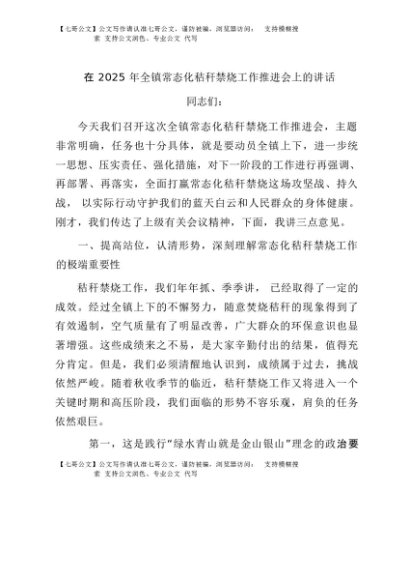 【七哥公文】2025年:在2025年全镇常态化秸秆禁烧工作推进会上的讲话+更多免费公文+VX:QiGeGongWen2024