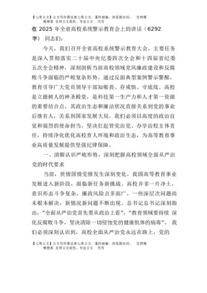 【七哥公文】2025年:在2025年全省高校系统警示教育会上的讲话(6292字)+更多免费公文+VX:QiGeGongWen2024