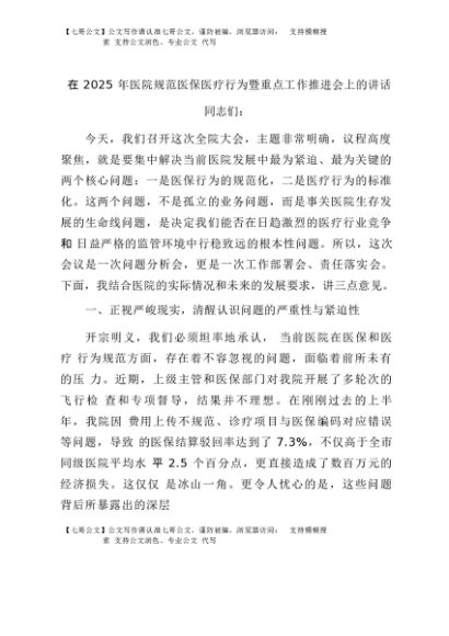 【七哥公文】2025年:在2025年医院规范医保医疗行为暨重点工作推进会上的讲话+更多免费公文+VX:QiGeGongWen2024