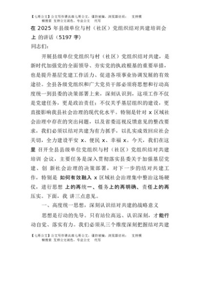 【七哥公文】2025年:在2025年县级单位与村(社区)党组织结对共建培训会上的讲话(5197字)+更多免费公文+VX:QiGeGongWen2024