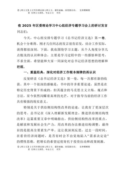 【七哥公文】2025年:在2025年区委理论学习中心组经济专题学习会上的研讨发言+更多免费公文+VX:QiGeGongWen2024