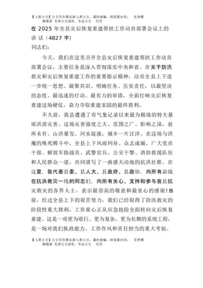 【七哥公文】2025年:在2025年全县灾后恢复重建帮扶工作动员部署会议上的讲话(4827字)+更多免费公文+VX:QiGeGongWen2024