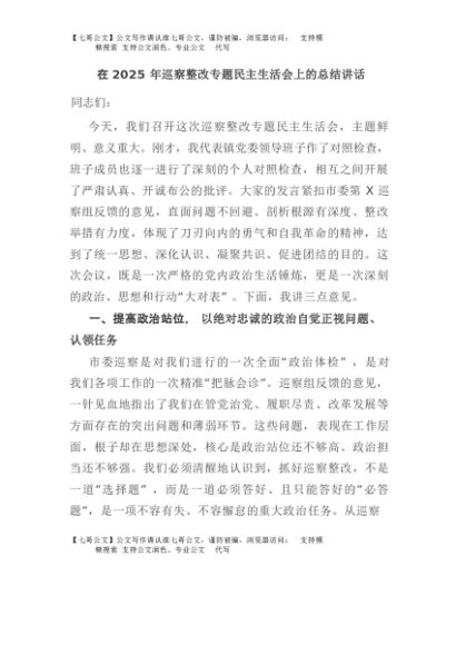 / 【七哥公文】2025年:在2025年巡察整改专题民主生活会上的总结讲话+更多免费公文+VX:QiGeGongWen2024