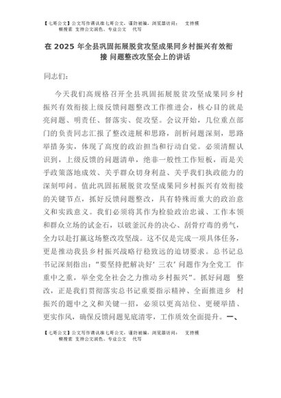 【七哥公文】2025年:在2025年全县巩固拓展脱贫攻坚成果同乡村振兴有效衔接问题整改攻坚会上的讲话+更多免费公文+VX:QiGeGongWen2024