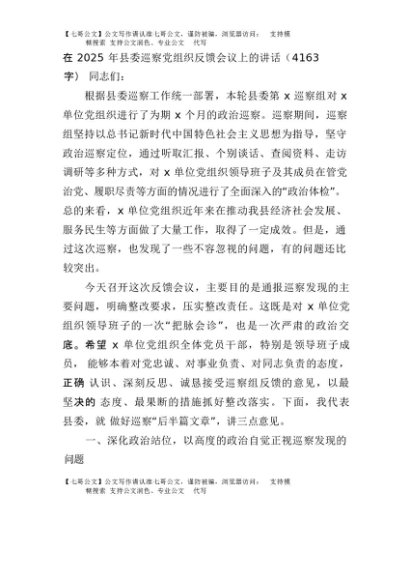 【七哥公文】2025年:在2025年县委巡察党组织反馈会议上的讲话(4163字)+更多免费公文+VX:QiGeGongWen2024