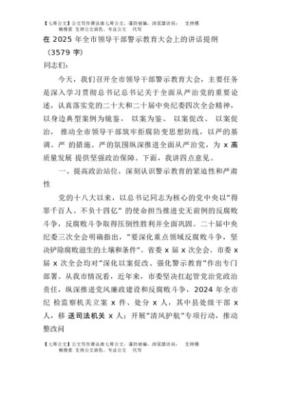 【七哥公文】2025年:在2025年全市领导干部警示教育大会上的讲话提纲(3579字)+更多免费公文+VX:QiGeGongWen2024