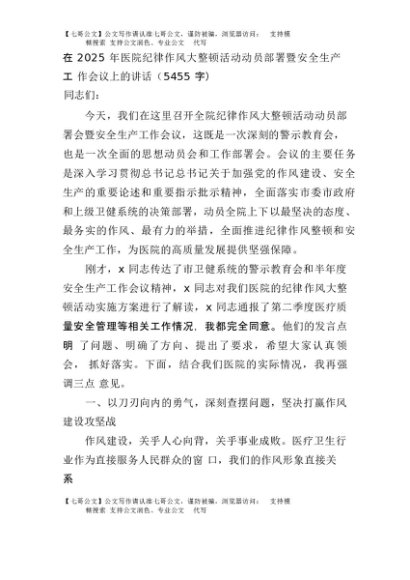 【七哥公文】2025年:在2025年医院纪律作风大整顿活动动员部署暨安全生产工作会议上的讲话(5455字)+更多免费公文+VX:QiGeGongWen2024