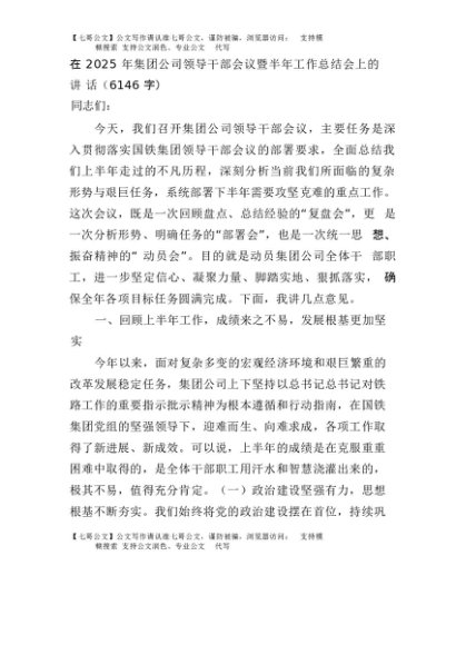 【七哥公文】2025年:在2025年国企领导干部会议暨半年工作总结会上的讲话(6146字)+更多免费公文+VX:QiGeGongWen2024