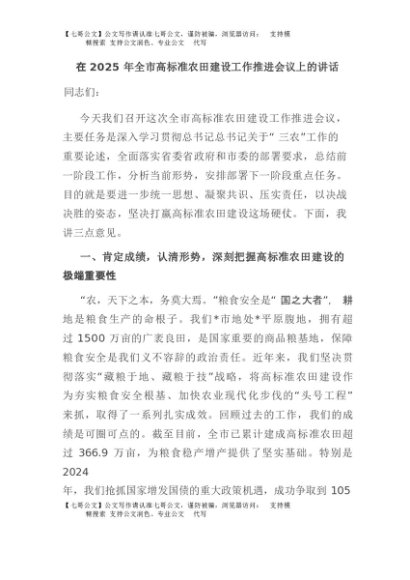 【七哥公文】2025年:在2025年全市高标准农田建设工作推进会议上的讲话+更多免费公文+VX:QiGeGongWen2024