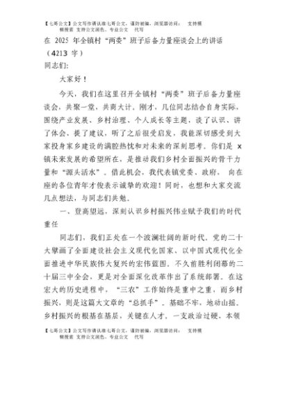 【七哥公文】2025年:在2025年全镇村“两委”班子后备力量座谈会上的讲话(4213字)+更多免费公文+VX:QiGeGongWen2024
