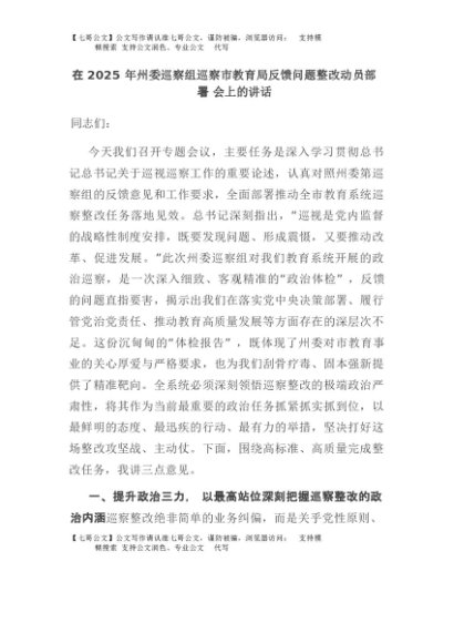 【七哥公文】2025年:在2025年州委巡察组巡察市教育局反馈问题整改动员部署会上的讲话+更多免费公文+VX:QiGeGongWen2024
