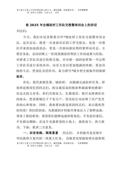 / 【七哥公文】2025年:在2025年全镇驻村工作队交接暨培训会上的讲话+更多免费公文+VX:QiGeGongWen2024