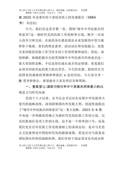 【七哥公文】2025年:在2025年县委年轻干部培训班上的党课报告(5884字)+更多免费公文+VX:QiGeGongWen2024