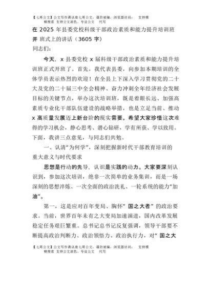 【七哥公文】2025年:在2025年县委党校科级干部政治素质和能力提升培训班开班式上的讲话(3605字)+更多免费公文+VX:QiGeGongWen2024