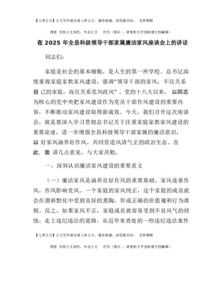 【七哥公文】2025年:在2025年全县科级领导干部家属廉洁家风座谈会上的讲话+更多免费公文+VX:QiGeGongWen2024