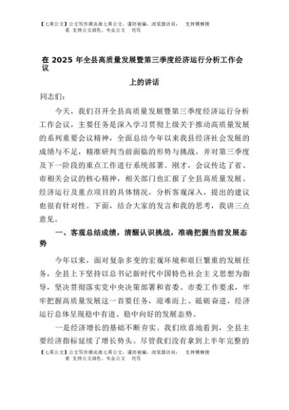 【七哥公文】2025年:在2025年全县高质量发展暨第三季度经济运行分析工作会议上的讲话+更多免费公文+VX:QiGeGongWen2024