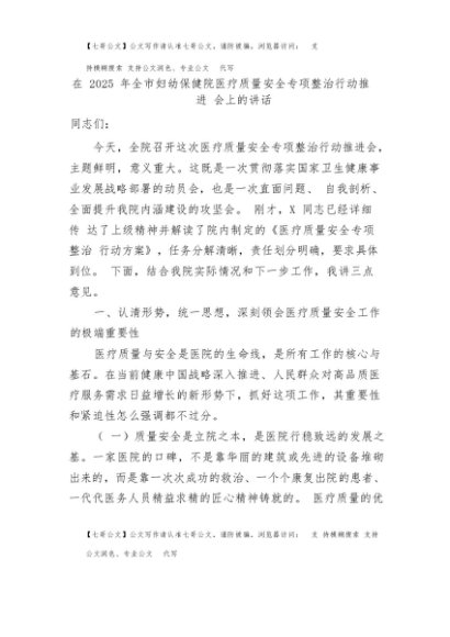 【七哥公文】2025年:在2025年全市妇幼保健院医疗质量安全专项整治行动推进会上的讲话+更多免费公文+VX:QiGeGongWen2024