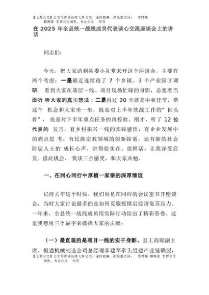 【七哥公文】2025年:在2025年全县统一战线成员代表谈心交流座谈会上的讲话+更多免费公文+VX:QiGeGongWen2024
